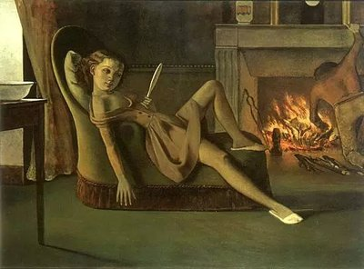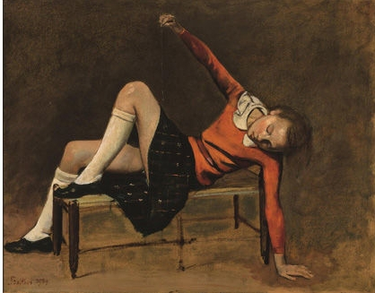 “猫与女孩”这个特展,主要集中展示巴氏在上世纪30年代中期至50年代的一辑画于巴黎和瑞士的作品,共35幅。除了大都会馆藏之外,分别从法、英、瑞士、澳大利亚的美术馆和私人收藏借展。所谓猫与女孩,是以巴氏邻居的女孩子Blanchard为模特儿而描绘的一系列作品。许多画作都揭示了这个正值进入青春期的女孩,在一个关闭的空间里阅读、沉思、做梦,徘徊于天真无邪与知性成熟之间的一种思春情景。其高妙之处,就是巴尔蒂斯糅合了一种自发的春情和严肃的规范,以一种神秘的暗示、稍带微笑的横送秋波的感觉,与冷静沉着的严峻气氛,统合在一个深棕色的调子里;而且许多作品都有一只神秘兮兮的猫儿出现,给寂静的画面注入一点隐秘迷人的活力。