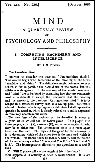 图灵文《机器能否思考》发表于期刊《Mind》第59期,236号,1950.