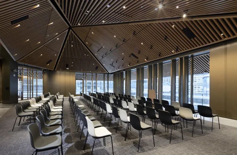 图书室座位区和会议室区顶部有规律地使用射灯进行基础性照明,照亮空间,通过灯光的照亮,室内的整个环境看起来比较有画面感,让人充满想象。