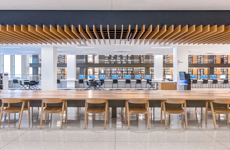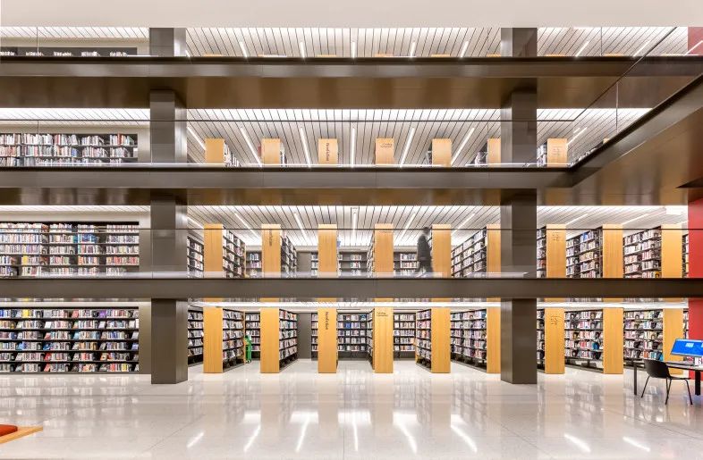 图书室书架区顶部使用线性型灯照明,通过灯光照亮,增加空间层次感,灯影映照在地面上,让整个环境变得更加干净整洁。