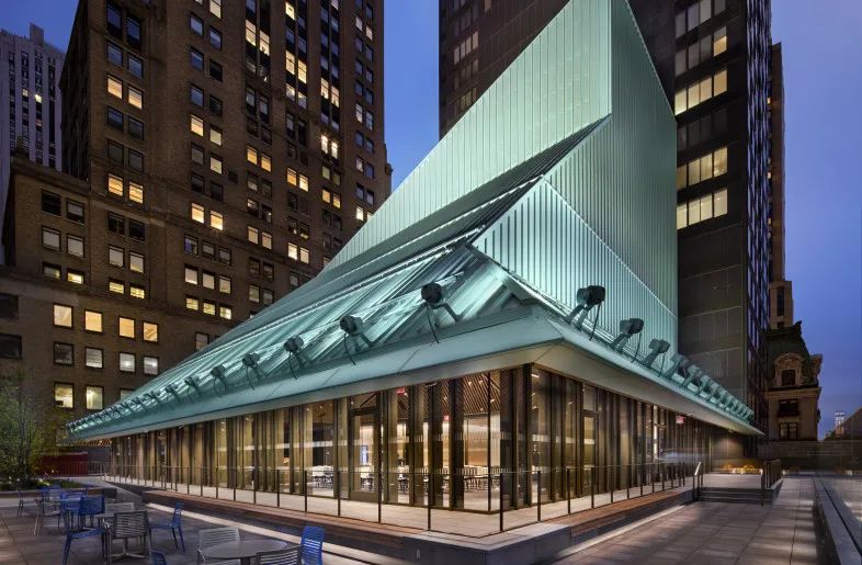 纽约市的Stavros Niarchos基金会图书馆由Mecanoo和 Beyer Blinder Belle 构想,以满足该市当今社区的需求。Stavros Niarchos基金会图书馆 (SNFL) 位于第五大道的前曼哈顿中城图书馆内,是一个年发行量达200万册的机构。建筑面积16722平方米,放眼望去,整座建筑造型似一顶巫师的帽子,通过洗墙灯整体洗亮,柔和的光线与建筑相融合;而其不规则的建筑形态用过灯光的照亮,立面感更强了。