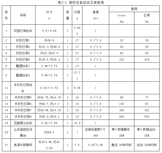 西安霊御酒吧采用最新理念设计,利用目前最新的酒吧空间综合利用工艺设计技术、舞台机械设备技术、声光电集成技术等方法,将酒吧上空空间、墙立面综合利用起来,完成空中移动可变表演走廊、墙面立体旋转变换舞台、升降倾斜组合变化灯架、空中双向平移道具灯架台车等综合集成功能,让酒吧空间在多彩变换的灯光演绎中实现空中形态、表演空间的多种组合变化,给客人带来震撼梦幻的全景体验和娱乐享受,是今后酒吧设备工艺设计的参考典型。设备组成及参数见表3-3。