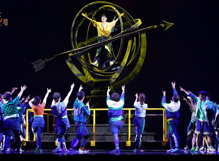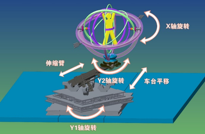浑天仪球体由外圈、中圈、内圈(分别含3、3、2道环)共8道层层嵌套的圆环组成,最大直径3.6m;内圈可站1人,与外圈相对固连;中圈可绕水平轴(X轴)旋转,外圈可沿竖直轴(Y2轴)旋转。球体底座装在一个呈25°仰角的伸缩臂上,最小长度2.1m,伸缩行程2.4m。伸缩臂底座可沿竖直轴(Y1轴)旋转,底部的车台可沿舞台中心线前后平移16m。伸展后的浑天仪装置最大高度6m,最大旋转直径8.6m。