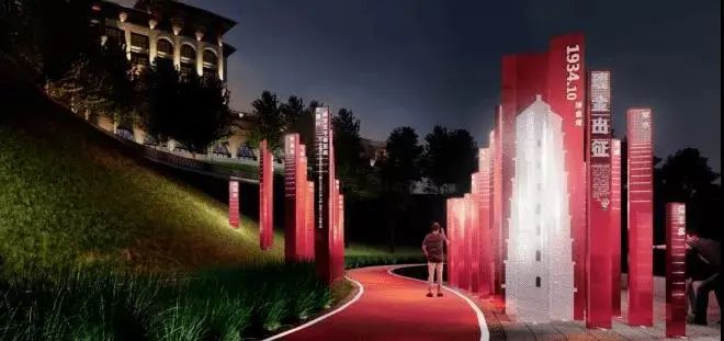 沿湖岸打造的长征公园成为红色主题的集中展示区。设计师以中央红军长征路线为设计线索,结合标志性节点打造瑞金出征、遵义会议、飞夺泸定桥、爬雪山、大会师等红色主题场景,每个场景都可以扫码听取事先录制好的长征故事。