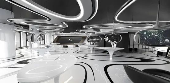 每一处5G应用就是一个“岛屿”,设计师通过地面与天花的线条如“河流”般将这些岛屿环绕、串联,形成了联结,映衬出5G“汇聚关联”的意向,通过灯光的视觉意向,突出5G“汇聚关联”的科技属性,以最简洁的布灯手法,实现5G实验室所要呈现的未来感与科技感。