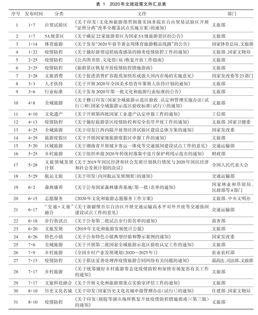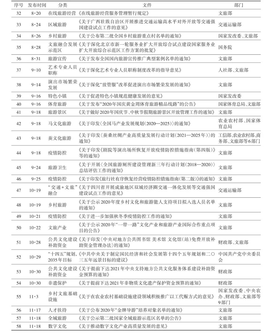 为观察和研究方便,本文以“文旅融合”“文化旅游”“文旅产业”等为关键词,在中国政府网、文化和旅游部官网、北大法宝等网站进行检索,最终筛选出69项政策文本,深入分析我国文旅产业政策的整体性特征、重点场域以及未来趋势。2020年我国文旅产业政策的整体性特征