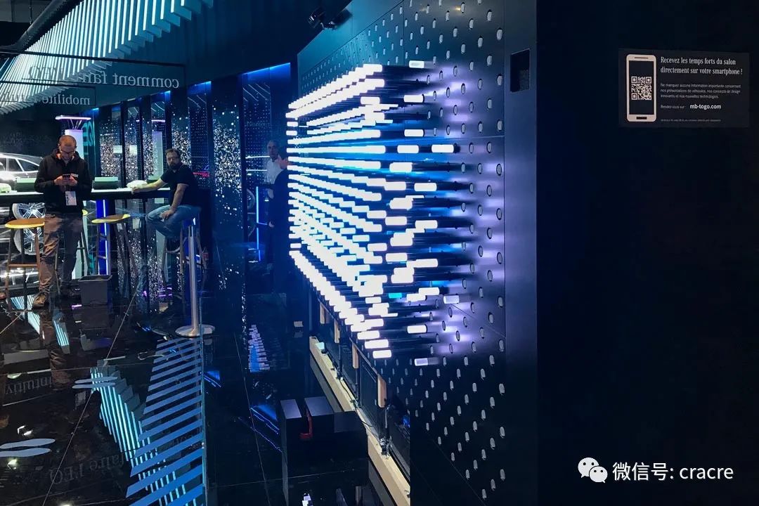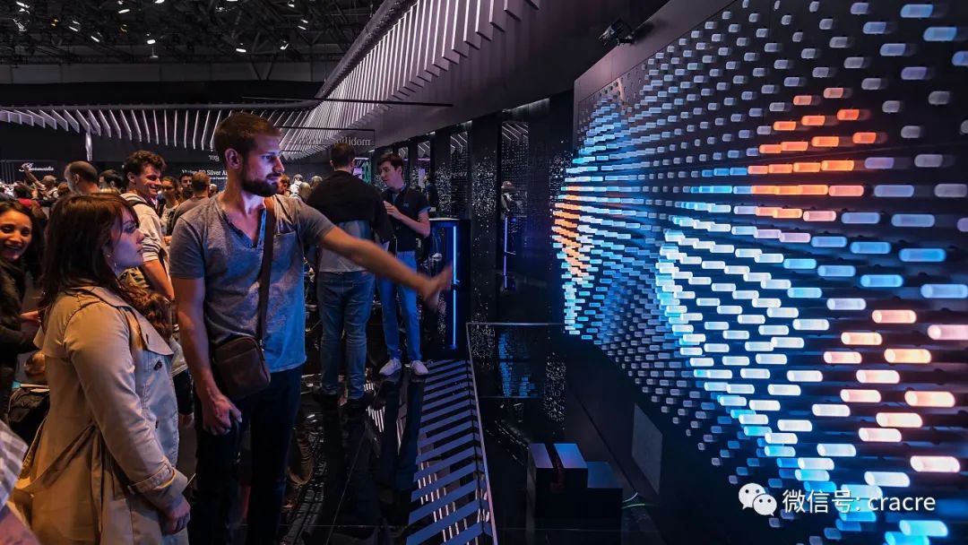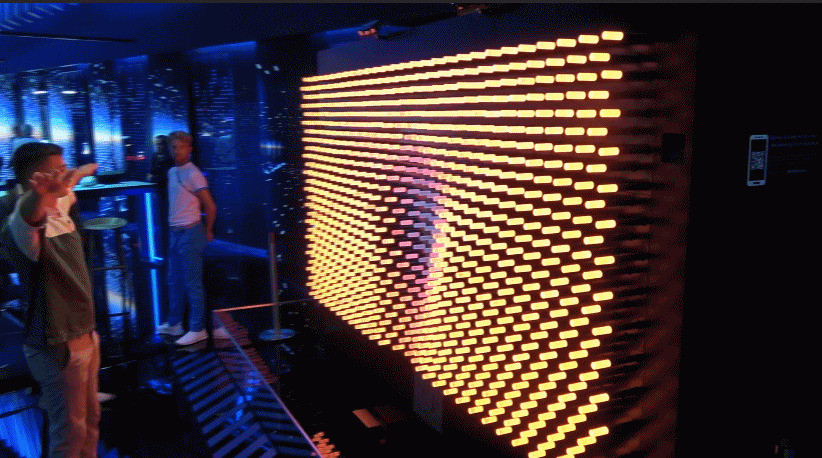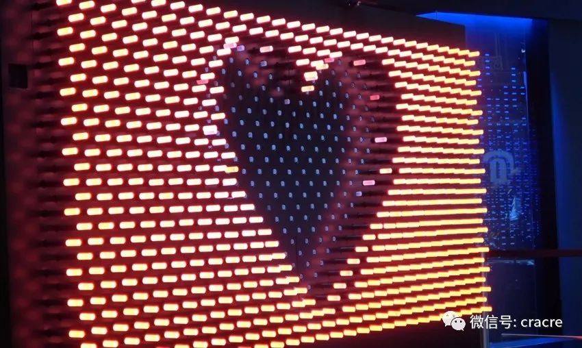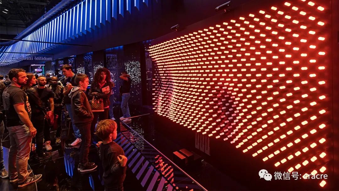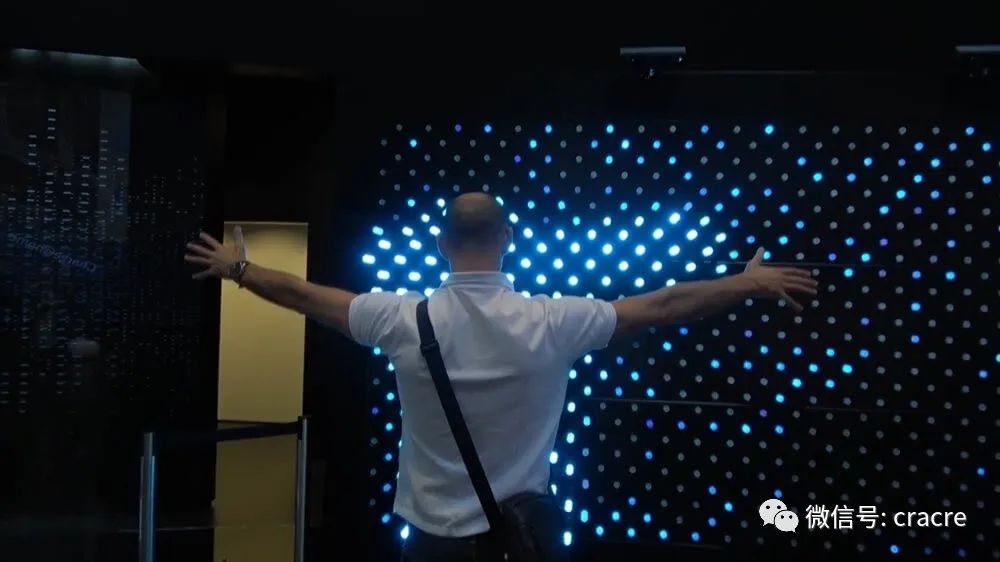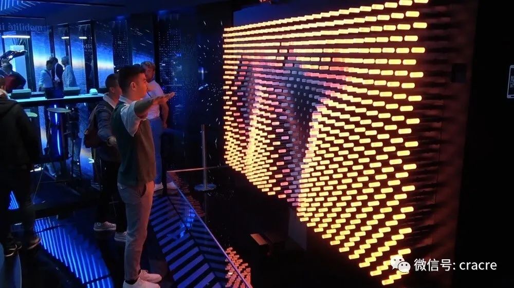 你可以近距离与他互动,机械点阵和灯光同步变化,整齐而生动。