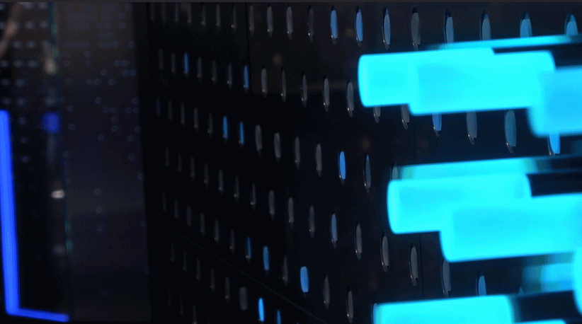 由 756 个独立控制的灯光棒(亚克力)构成,通过编程来展示灯光的机械矩阵变化。