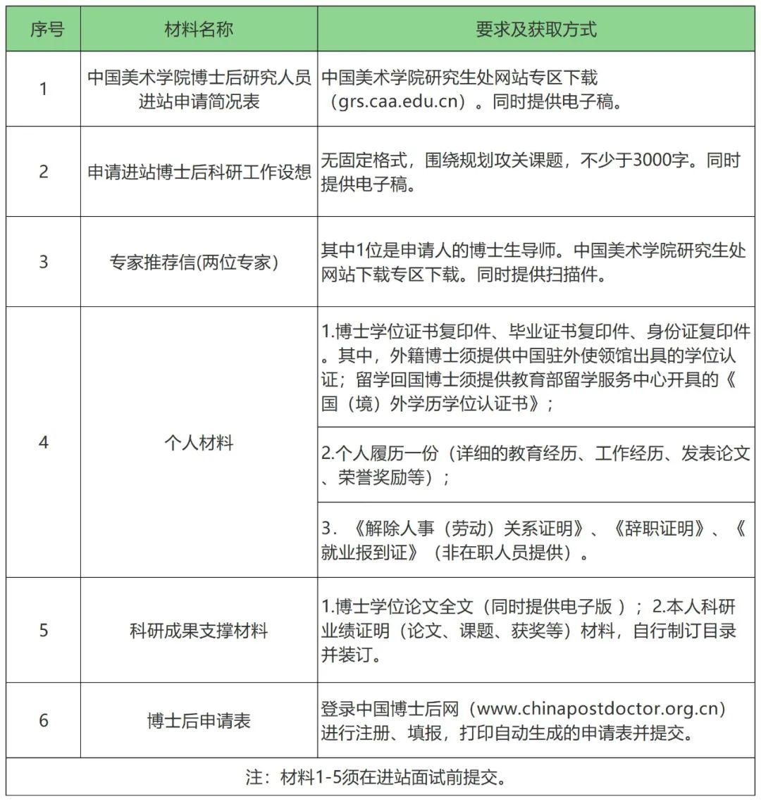 1.具有博士学位,品学兼优,身体健康,进站时年龄一般在35岁以下(含35岁),有突出业绩的最多放宽至38周岁。按国家有关政策要求,我校毕业的博士学位获得者不得进入与本人博士学位所属的一级学科相同的博士后研究方向。2.定向委培、在职人员以及现役军人身份的进站人员需脱产从事博士后研究工作;党政机关干部不得从事博士后研究工作。3.具备一定的学术水平和业务能力,符合各流动站要求的进站条件,符合下列条件之一:(2)进站前,以独立或第一作者(通讯作者视同第一作者,下同)身份,文、史、哲、艺在SSCI、A&HCI期刊上发表学术论文1篇,或者CSSCI来源期刊上发表论文1篇。(3)作为主要完成者(国家级排名前5,省部级排名前3)获得省部级三等奖以上的奖励。(4)参加过省部级以上研究课题(国家级排名前3,省部级排名前2),有材料证明已取得重要的阶段性研究成果。(5)确因研究项目或学科建设需要,有三位国内外知名的同行专家推荐,经博士后合作导师同意,流动站管理委员会评议认为有较大学术发展潜力者,可不受上述条件限制。4.申请进入流动站的超过35周岁人员,还需符合以下条件之一:我校招收进站人员为“中国美术学院博士后研究人员”,并以此名义开展研究和相关工作。1.全职进站人员。签订相关协议,可享受基本年薪、科研启动经费、租房补贴等待遇,缴纳“五险一金”,参照事业编制人员享受福利。超出进站协议规定的科研业绩可参照教职工予以奖励。2.在职进站人员。签订相关协议,在职进站人员不享受基本年薪、住房补贴和“五险一金”,其他待遇与全职进站人员相同。1.基本年薪。博士后研究人员实行年薪制,正常工作年限内,前两年年薪25万元人民币(含社保、公积金等相关费用),第三年为12.75万元,第四年为8万元。原则上在站不超过五年,第五年无待遇。根据学校核定的待遇水平按月发放。2.租房补贴。博士后在站期间,根据实际情况,可租住学校住房,并按学校有关规定缴纳租金;或由学校提供租房补贴1800元人民币/月,连续发放36个月。3.科研启动经费。按实际所用报账,在站期间每人10万元,一次核定,全程使用,纳入科研经费管理,专项用于科研工作。4.凡在我校从事博士后研究工作期间,超出进站协议约定工作业绩的:①以学校为第一署名单位发表的论文和获奖成果等,统一纳入学校科研奖励范围;②博士后以我校为第一单位且第一作者(或第一通讯作者)身份,与合作导师共同发表的论文,参照教师科研奖励进行分配。5.博士后研究人员出站考核优秀,可推荐参加所在学科的招聘或人才引进,聘用后享受学校当年人才引进相关政策待遇。中国美术学院常年组织招收博士后研究人员,进站考核相对集中开展,一般每年组织两次进站审查。2021年秋季接收进站申请的报名截止时间为10月8日。我校坚持公平竞争、择优录用和宁缺毋滥的原则招收博士后研究人员。1.信息发布与报名。学校根据每年博士后流动站或课题组的相关需求,在学校研究生处网站(grs.caa.edu.cn,“访学博后”栏)、视觉中国协同创新中心及其他设站院系的微信等平台面向社会发布博士后招收信息。申请人填写《中国美术学院博士后申请简况表》,将申请简况表、代表性学术成果和博士学位论文等材料一同寄送至流动站。2.面试考核。学校根据进站条件进行资格审查,邀请申请者来校参加综合面试,择优确定拟招收对象。面试通过后,递交校博士后管理委员会(下称博管会)审核,通过后确定录用。其中,外籍、港澳台人员须经国际交流与合作处审核。3.网上申报。学校面试考核通过后,拟招收对象登录中国博士后(http://www.chinapostdoctor.org.cn/)网站,在线注册、申请,打印有关材料一式4份,经流动站负责人(在职人员还需所在单位负责人)签署审核意见后,报省博管办审批。4.进站报到。学校安排体检(或提供二级甲等及以上医院最近6个月内的体检报告)。体检合格后办理报到手续,并签订相关协议。1.加强日常管理,每学期组织一次由导师、在站博士后研究人员参加的集中的研究报告会。2.推进科研驱动模式,在合作导师的指导下,围绕规划攻关课题,申报省部级及以上课题。3.应当根据学校安排,承担相关教学任务,原则上每学期不少于54课时。在职进站者可不作要求。2.在站期间以中国美术学院为第一署名单位发表CSSCI来源期刊两篇(或CSSCI来源期刊1篇及经认定的高水平学术专著一部)。3.在站期间以中国美术学院为第一完成单位主持省部级科研课题1项(或国家博士后科学基金1项,或省部级以上科研奖励1项,浙江省博士后科研择优资助1项)。如主持国家级科研课题立项则另行给予奖励。中国美术学院博士后管理工作由研究生处(校博管办挂靠)负责统筹,设计学流动站日常管理由文创设计制造业协同创新中心承担。1.联系地址:浙江省杭州市西湖区转塘街道中国美术学院11#201文创设计制造业协同创新中心3.联系邮箱:caalab@126.com(报名邮件标题务必注明“博士后XXX方向事项”)。