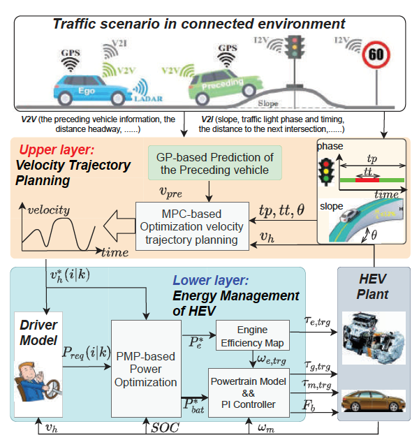 IFAC E-COSM是先进汽车动力系统控制领域的权威会议,每三年举办一届。本次会议的Benchmark挑战赛题目由来自日本、瑞典等国家的权威学者和日本丰田公司工程师联合提出,面向未来网联汽车控制前沿问题,聚焦城市工况混合动力汽车实时优化控制,旨在为挖掘网联环境下汽车节能潜力提供理论参考标准。我们的参赛队经过数月的精诚合作,在“AI+Control”的框架下,提出了网联混合动力汽车分层式智能节能控制方案,分别设计了基于高斯过程的车速预测模块、基于滚动时域优化的车速规划模块和多动力源动力输出分配模块。通过大会主办方的城市工况综合测试、论文评审环节,方案的实时性和可靠性得到了充分验证和专家肯定,并最终以全程总油耗1156.4g,领先第二名德国亚琛工业大学团队33.1g的成绩获得冠军。