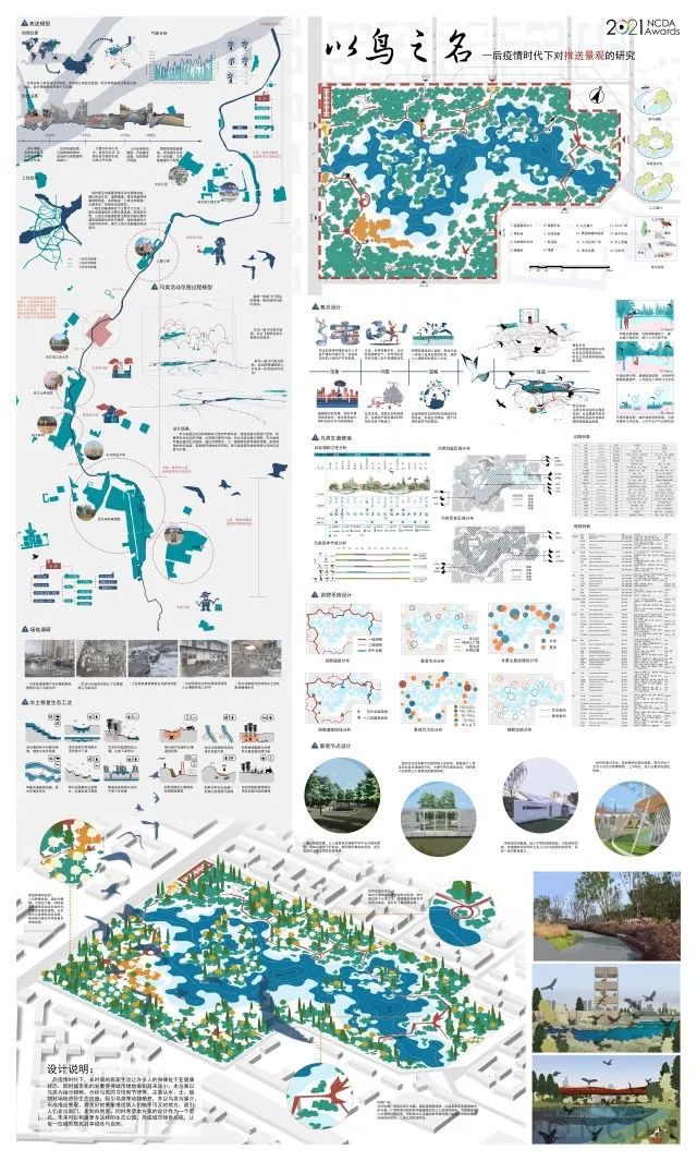 后疫情时代下,长时间的居家生活让许多人的身体处于亚健康状态。同时城市化的发展使得城市绿地面积越来越小。本方案以鸟类为指示物种,分析鸟类的习性和节律等,主要从水、土、植物对场地进行生态改造,吸引鸟类等动物栖息,并以鸟类为媒介,形成推送景观,将美好的景象推送到人们触手可及的地方,吸引人们走出家门,走到自然里。同时希望本方案的设计作为一个范式,未来可以构建更多这样的生态公园,形成城市绿色系统,让每一位城市居民共享绿色与自然。
