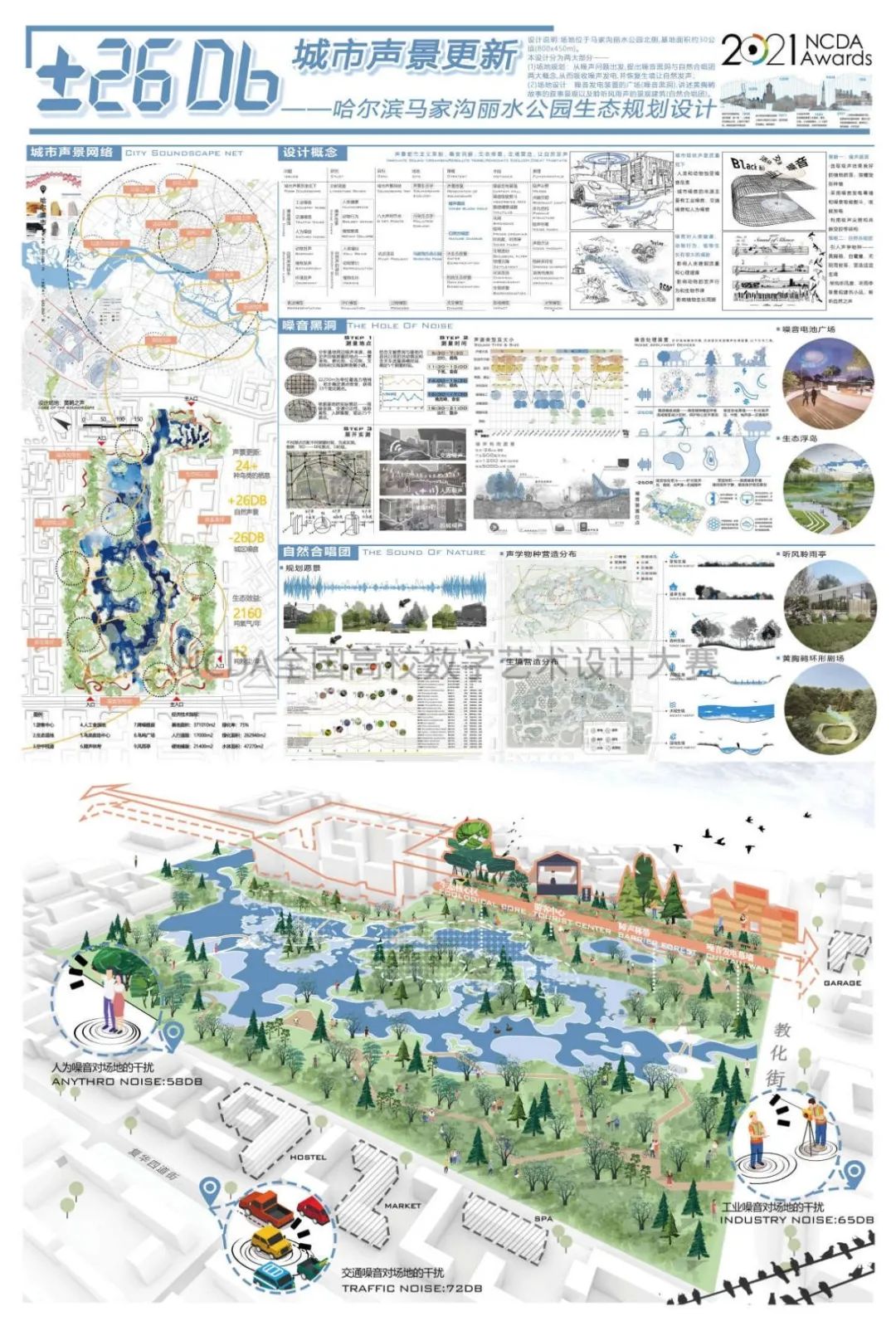 场地位于马家沟丽水公园北侧,基地面积约30公顷(800x450m)。本设计分为两大部分—— (1)场地规划:从噪声问题出发,提出噪音黑洞(-26Db)与自然合唱团(+26Db)两大概念,从而吸收噪声发电,并恢复生境让自然发声;(2)场地设计:噪音发电装置的广场(噪音黑洞),讲述黄胸鹀故事的叙事景观以及聆听风雨声的景观建筑(自然合唱团)。26分贝——场地调研时,我们发现,场地周边人为噪音峰值为72Db,场地中心声压级最低区域为46Db,遂取差值26作题。