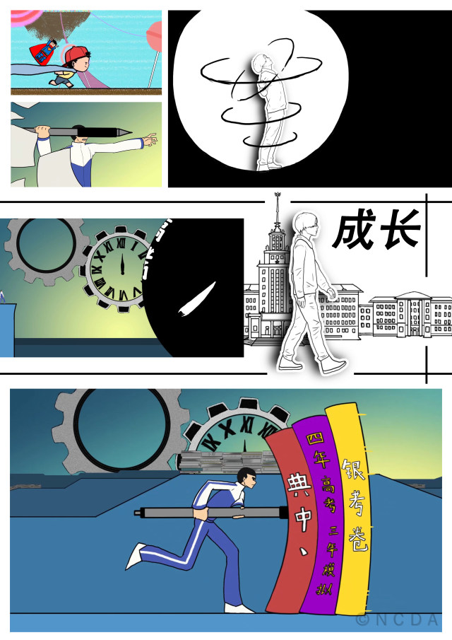 动画表现的是我们作为学生在这些年的学习生涯,从一个贪玩的孩子,到了疯狂刷题疯狂冲刺的中学,再到倍感新鲜但略有迷茫的大学。在创作的过程中还是融入了不少自己的想法,从儿童到中学时期那三本书即为中学“语数外”的入学考试,而那个中学时期漆黑的球状怪兽象征着高考,再例如大学时候角色的脚步是三个时期最慢的,展现我在大学时那种迷茫却又对未来有所期待的心理。动画整体分为三个阶段,三种画风,尝试挑战多种画风融合制作。