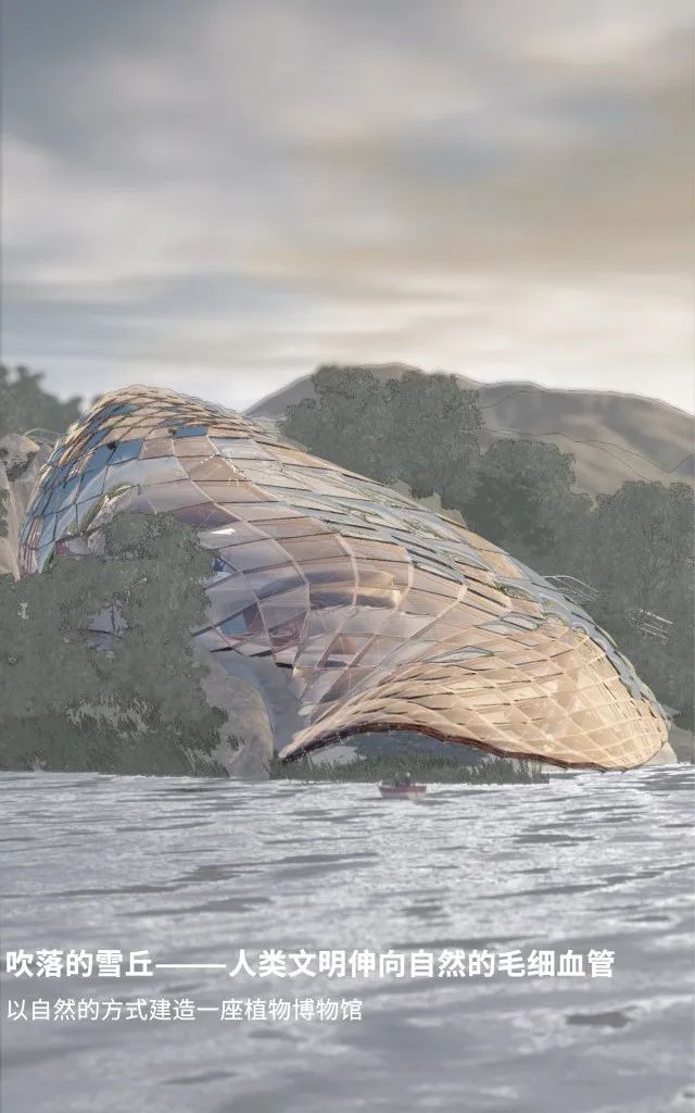 本设计选址于亚布力,结合了场地中山地的形态,以“群山中飘动的树叶”作为形态概念,生成了这个自然博物馆。