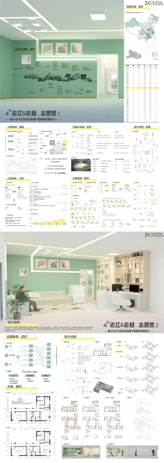 本设计基于公共卫生安全预防视角对武汉抗疫时期基层工作人员的日常提出了“4的N次方”室内设计的想法。方案采用方块的设计语汇将整个室内空间串联,并且办公区和卧室分别使用温馨明亮、干净稳定的色彩搭配使其适用于不同环境,改善社会志愿者在公共安全发生情况下的居住空间,保证其身心安全。