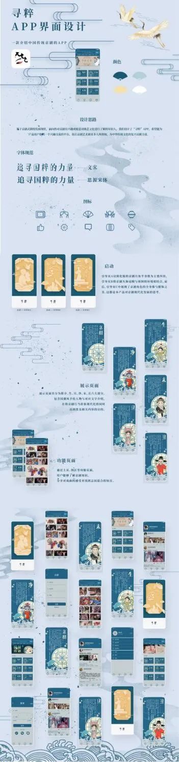 京剧作为中华民族传统文化的精粹,至今已有两百多年的发展历史。自徽班进京,京剧艺术不断发展,形成了生旦净丑的成熟行当与唱念做打的演绎程式,出现了四大名旦、四小名旦等著名艺术家与马谭杨奚等一系列艺术流派。京剧展现了中国人的价值观念,戏曲人物的行为取舍体现了人们对真善美的歌颂与追求,获得了广泛的群众基础与丰富的文化底蕴。然而现如今随着互联网的发展与快餐文化的冲击,京剧艺术渐渐淡出了大众尤其是年轻一代的视线,曾经万人空巷的盛况逐渐被门可罗雀的冷清取代。基于京剧式微的发展现状,面向仍对京剧有兴趣或愿意对曲艺文化进行了解的年轻人,我们设计了“寻粹”APP,希望能为产品用户提供一个兴趣交流的平台,也让京剧艺术被更多人所熟知,为中华传统文化的复兴贡献力量。该APP是以京剧艺术与当代文化相结合为主题、以弘扬传统文化为目的、以传承为关键词的移动端产品,着眼于知识科普与交流互通,主要有介绍与交流两种功能。该产品以年轻人为目标用户群体,主要服务于对传统曲艺有兴趣、愿意对此进行了解与交流的年轻一代。我们希望用户在使用该产品的过程中能够加深对京剧文化的了解并找到志同道合的伙伴。