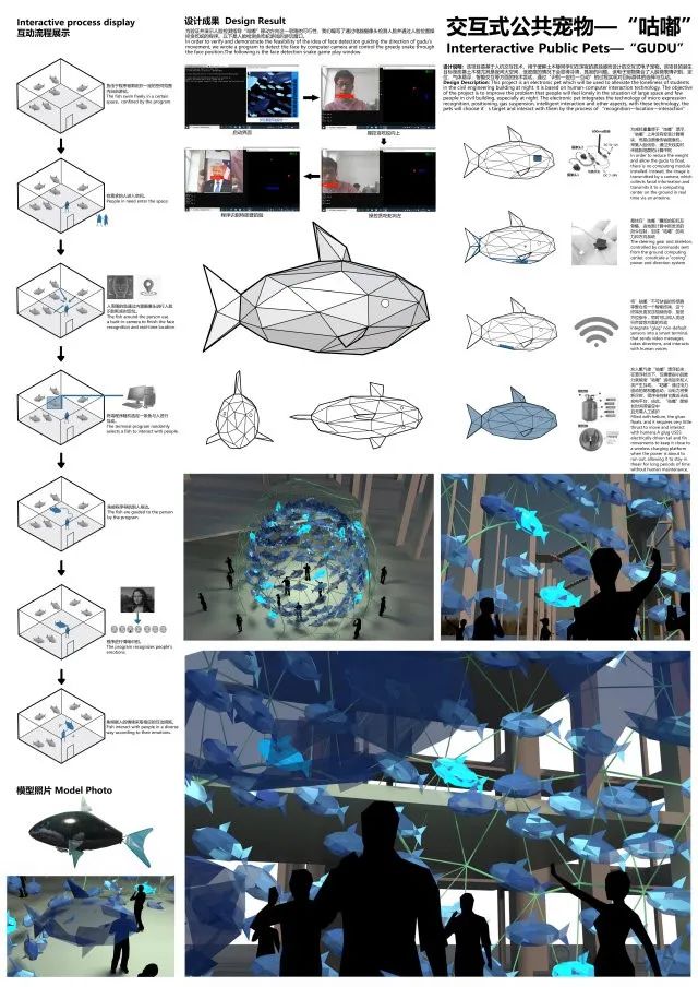 当人类渺小的身躯和幽深的思维被置于广阔的空间内时,人自身很容易被近乎虚空的场所带来的孤独感淹没。交互式公共宠物“咕嘟”,以谐音可爱的拟声词来解构缠扰现代人的“孤独”。“咕嘟”将以鱼群的形态巡游于空旷的空间内,将僵硬冰冷的空间转化为活泼与安静并置的柔性空间。“咕嘟”系统通过局域网组织的分布式信息采集与运算系统在虚拟空间织就一张信息之网,通过终端鱼眼采集人脸图像等信息,在控制端利用人脸检测、情绪识别等智能模块嗅探空间内人类的心情变化,情感、数据与空间由此发生对话。