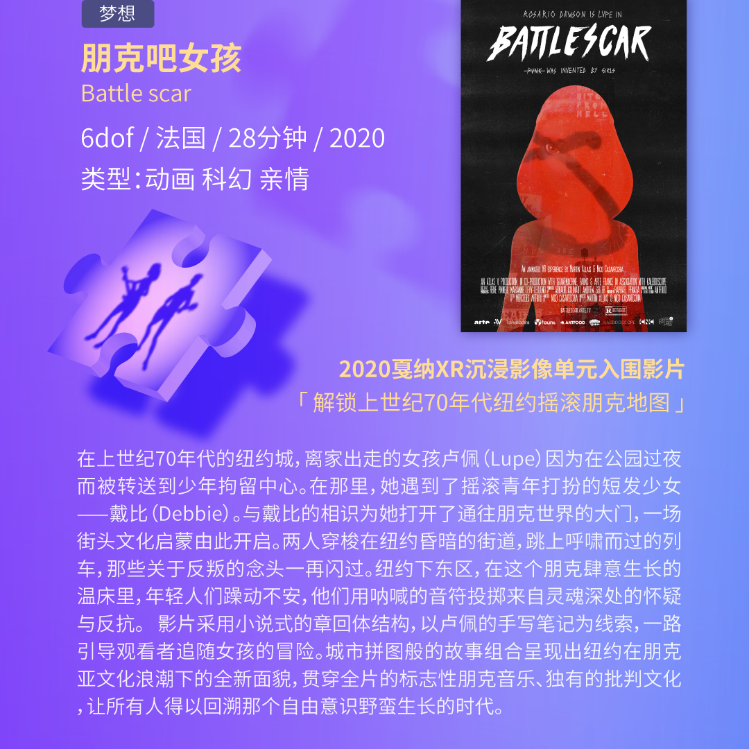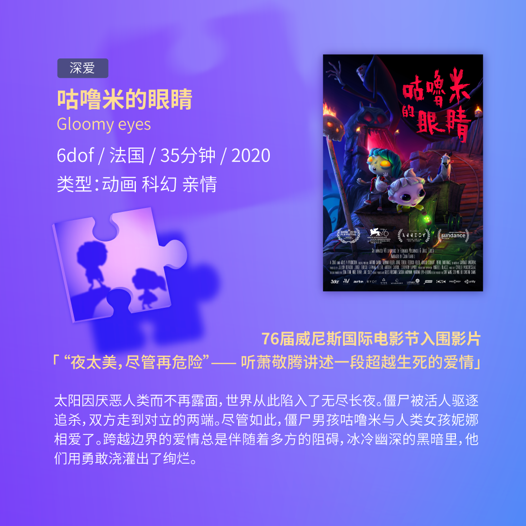 关于“爱情、亲情、友情、梦想”都能在《时光投影里的秘密》、《唤醒:妈妈的秘密》、《朋克吧女孩》、《咕噜米的眼睛》找到共鸣与启发,伴随沉浸式互动体验,被称为一场“直击灵魂的VR影像展”。