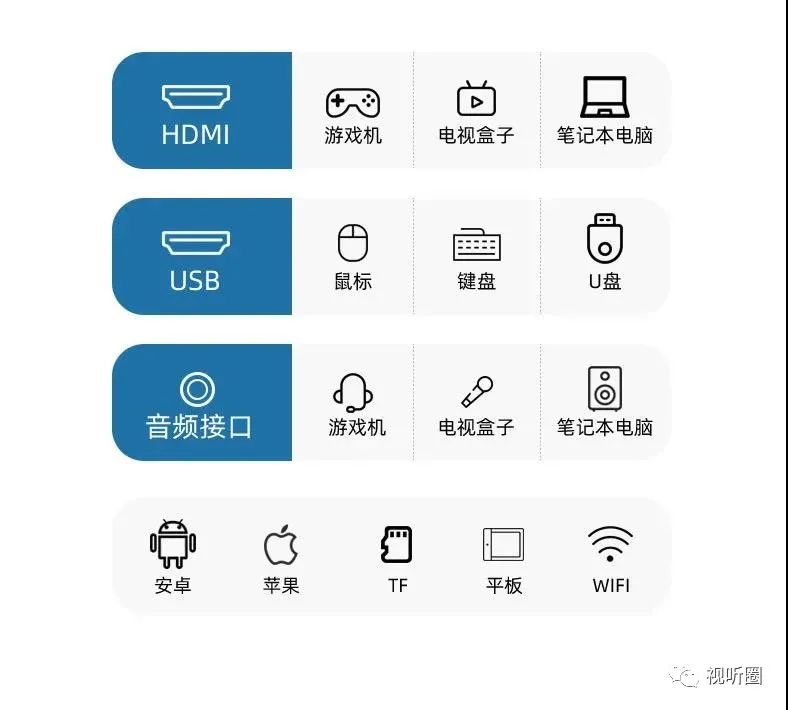 为了提供多元化观看使用需求,宝视来D200还具备丰富的接口,连接游戏机、电视盒子、笔记本电脑、U盘等等,满足不同场景下的使用需要。此外,宝视来智能投影机D200尺寸只有21.5*21.1*18cm,重1kg,使得携带投影机出门,或是在家中以及学校等场所更换投影空间,都变得十分简单,对于喜欢野营或户外活动时,想要看影片的人来说,也是很方便的设计。