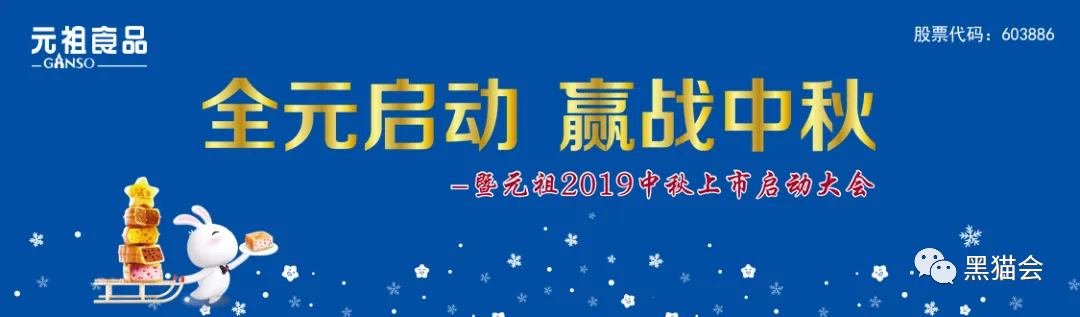 “全元启动 赢战中秋”元祖2019中秋上市启动大会。就将品牌“元”字提取进slogan。