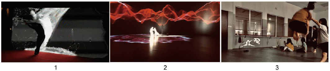 而实时交互则使多媒体设计师和舞者有更自由的发挥空间,通过由交互编程软件和跟踪设备(包括光学摄像头和可穿戴跟踪设备,前者如Kinect,Realsense,后者如惯性动作捕捉仪)构成的交互系统将舞者位置信号实时捕捉,并传递给交互编程软件、实时渲染引擎,由其实时生成视觉特效与舞者互动。这样的系统可以摆脱场地的限制,只需搭建简单的交互跟踪设备,编写交互程序,而不需要制作动画视频。另一方面,给使用者也带来创作、运用的空间,例如教学课堂上运用交互系统进行即兴创作,激发学生的的编舞兴趣(见图10中的3);在各类展示现场,运用交互使观众获得沉浸式体验(见图10中的2);在社区搭建的临时舞台,将交互体验带入社区(见图10中的1)。