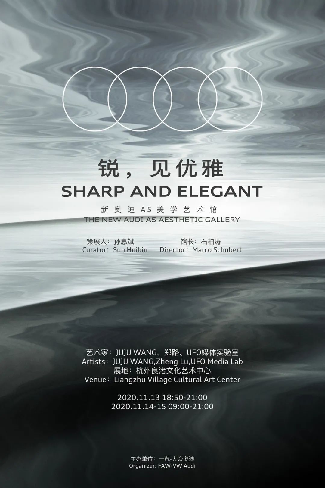 《淋漓》系列的文字源于唐代诗人白居易的诗歌《玩止水》。此诗立意为庄子的“人莫鉴于流水,而鉴于止水”。以文字构成的雕塑诉说着水在运动中的静态。该作品与新奥迪A5不仅在工艺上都采用相似的薄板锻造技艺,同时二者都依据空气动力学带来的极致速度感,以静态演绎动态造型。涓涓涟漪变成液态金属,犀利的造型飞悬于新奥迪A5之上。艺术家正是以这种一柔一刚的有力对撞,诠释着新奥迪A5锐利与优雅交糅的美感与速度。