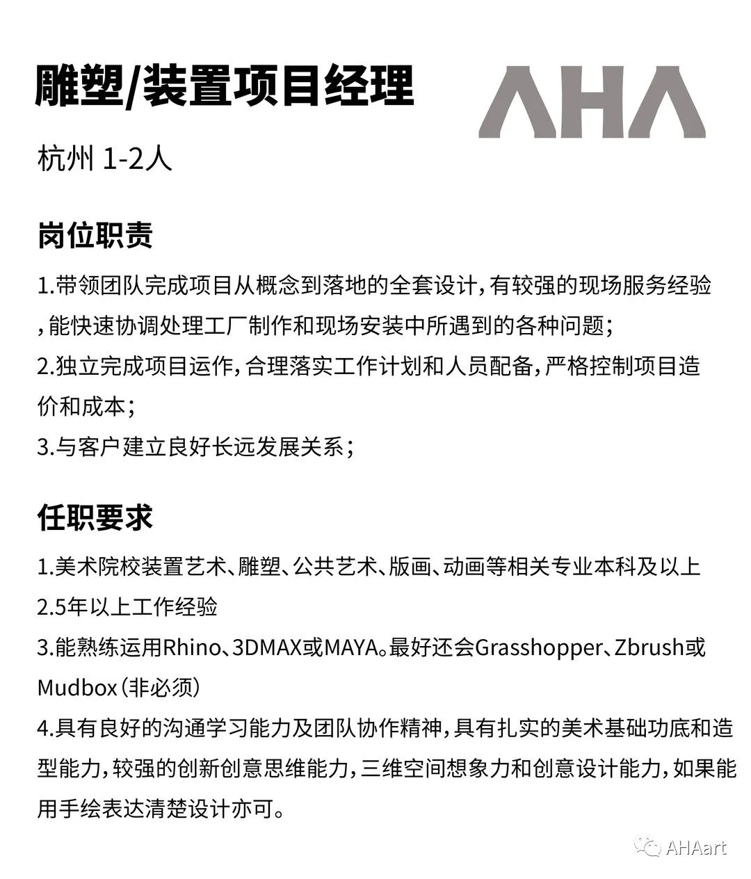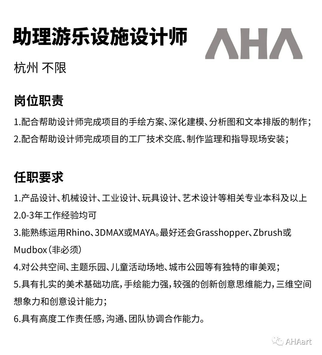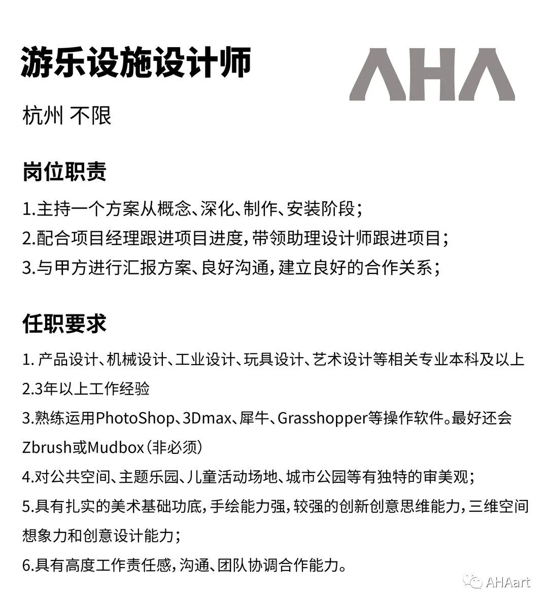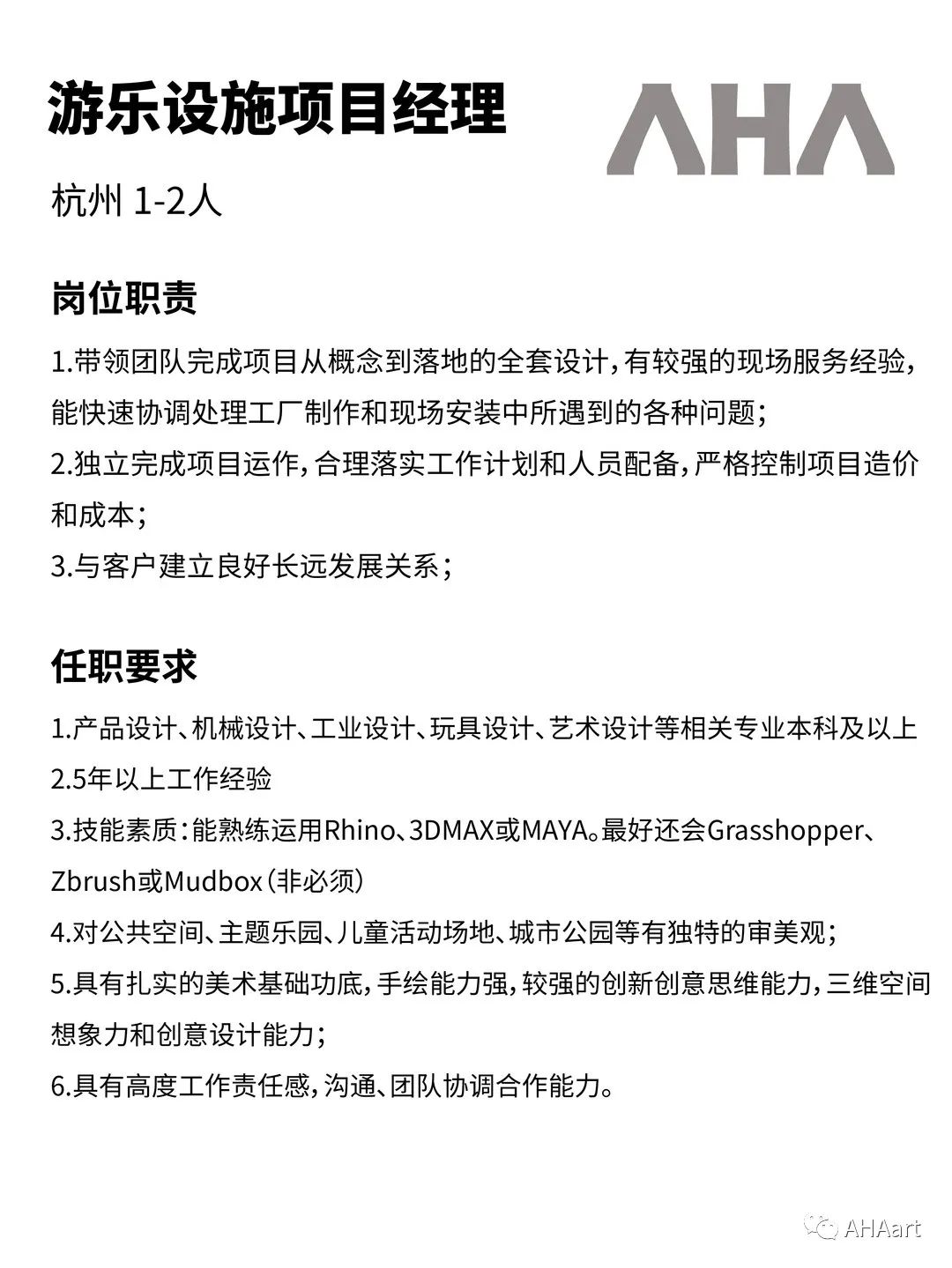 - 【杭州】AHA招募 商务专员、工程部经理、装置设计师、游乐设施设计师......