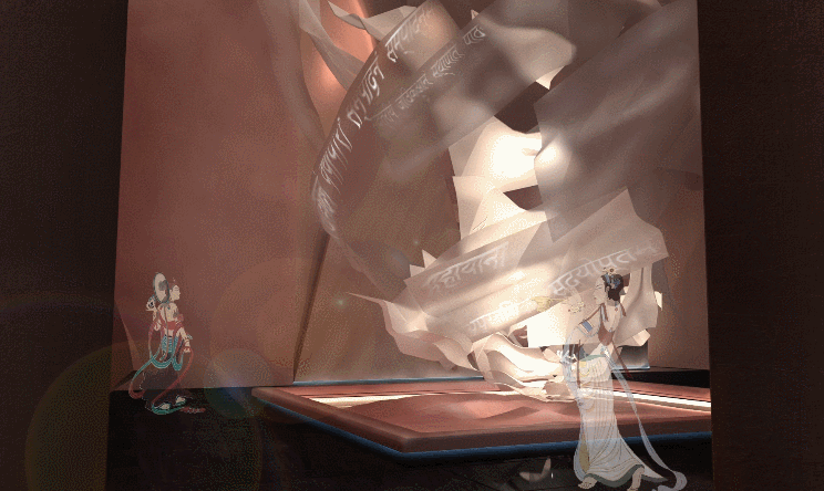 在内容上,作品以四个展厅作为四个连续的故事,观者作为空间的主角,由NPC引导观者去探索敦煌故事。