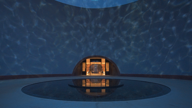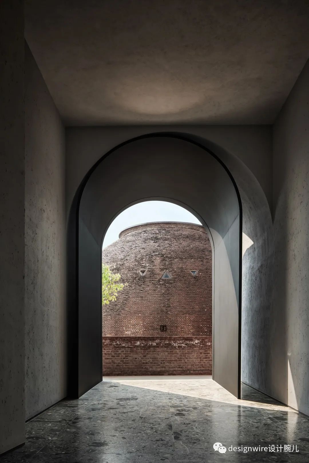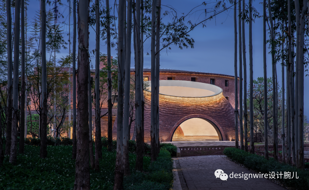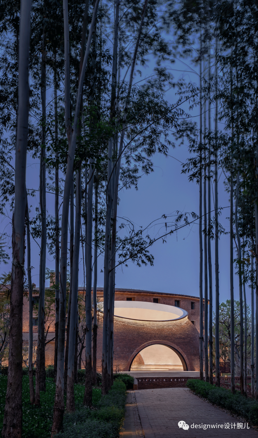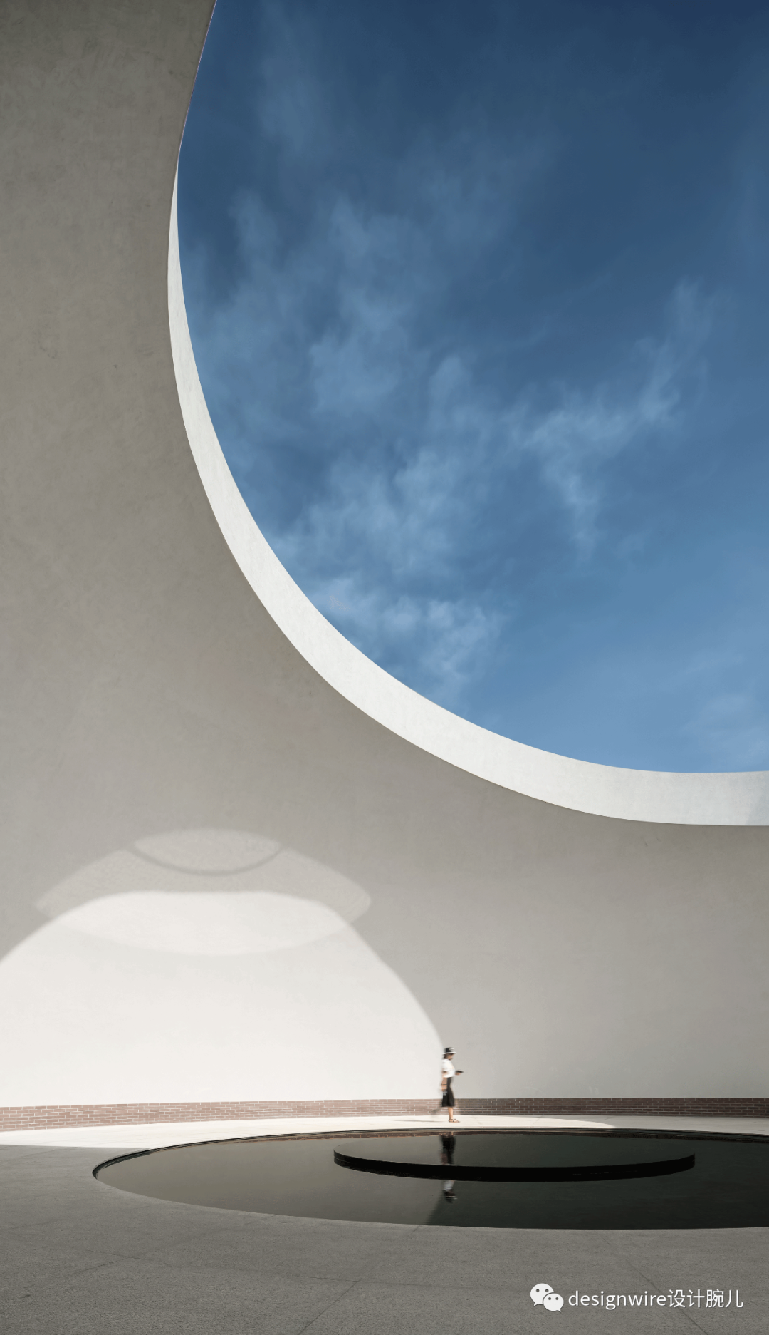 入口处,碗形的“到达亭”顶部直面天空的开口,于亭内形成动人的回声效果。日间,倾泻而下的天光在建筑内壁形成流转的光影,增维空间的层次;夜间,环绕的墙面配合现代灯光装置上演换装秀,用波光粼粼的视觉效果与中心水面相映成趣。