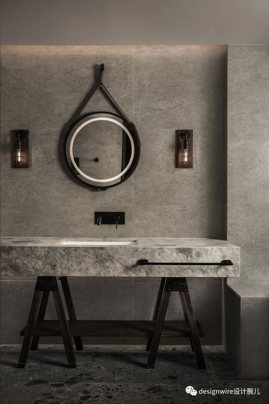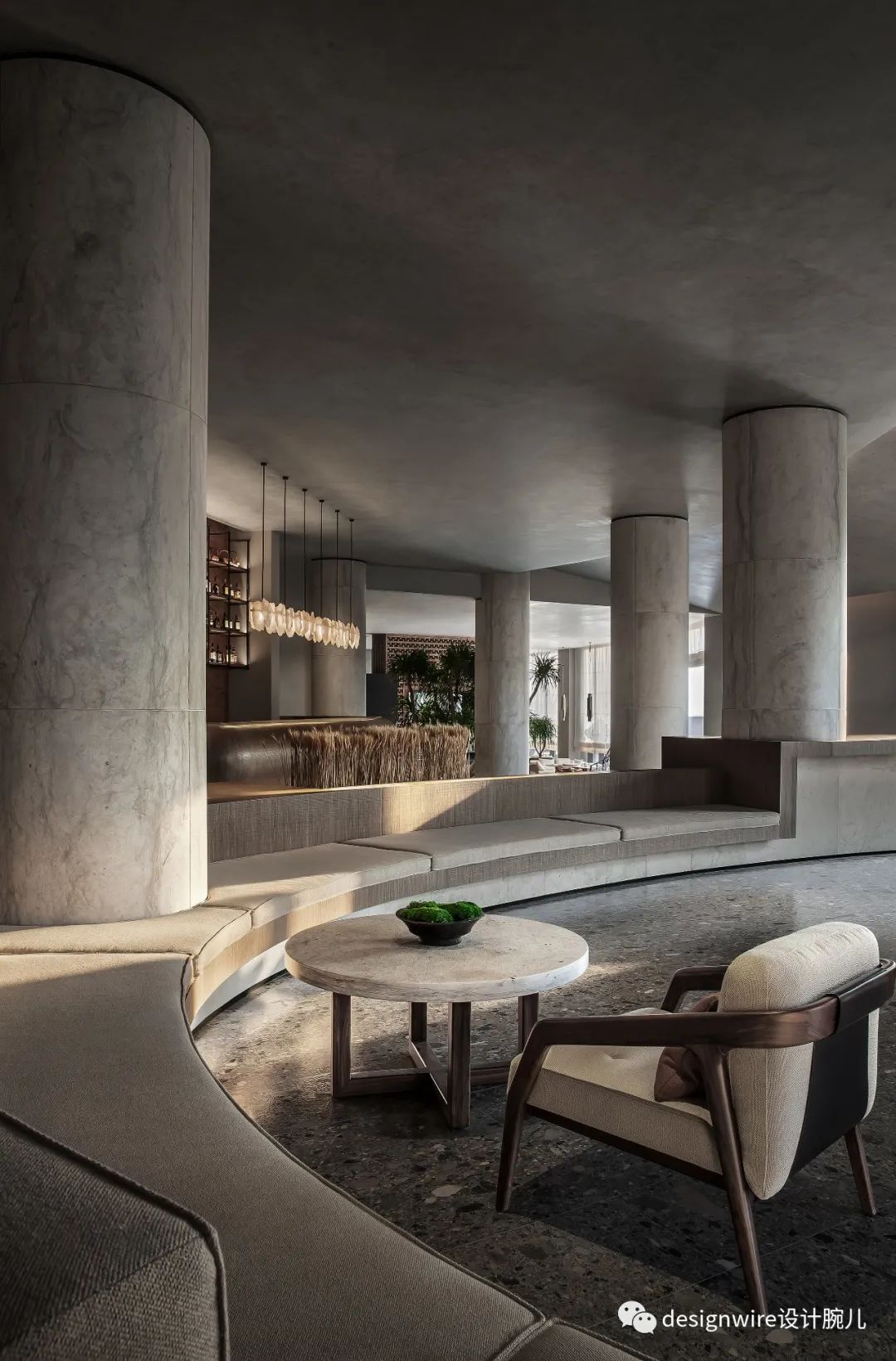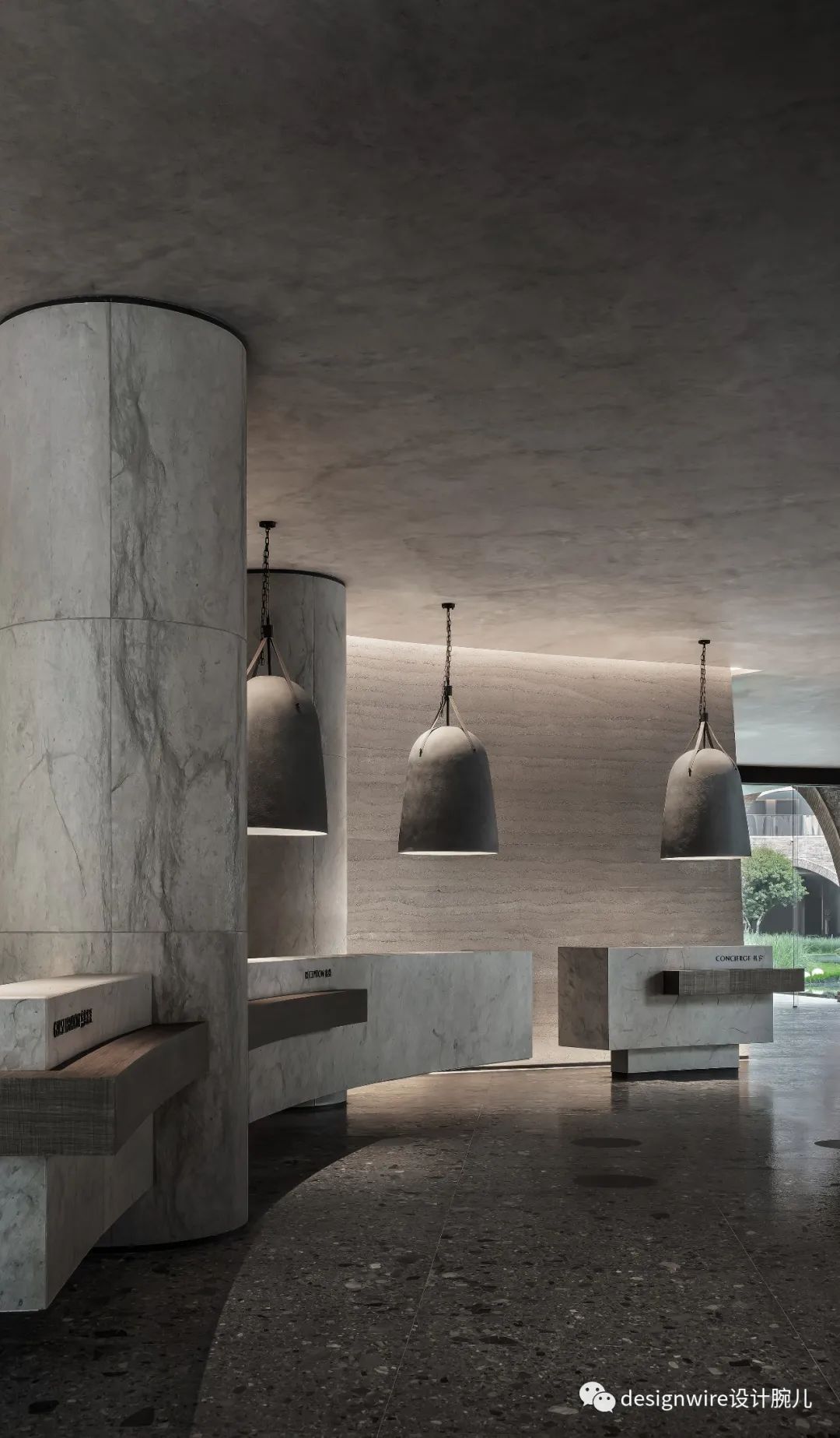 水泥的背景墙面及圆柱、瓦罐造型的灯饰、几何立体的前台的都充满了雕塑形式的力量感、立体感、稳定感,各自具有独立的气场,但也能彼此交融相搭。大堂休息区