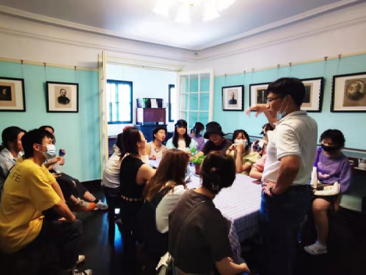 为了达到这一授课目的,彭勇文教授在课程思政建设的过程中,将这门课的一部分授课过程安排在了蔡元培先生的故居里,让学生追寻这位伟大教育家的人生轨迹和卓越贡献,探索我国美育的发展历程和社会功能,并在故居的会议室里现场展开讨论。