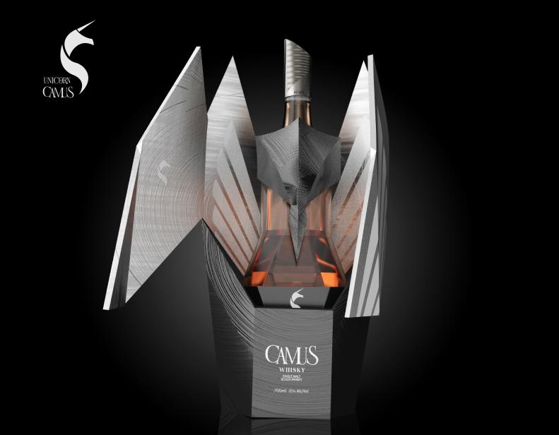 充满个性和故事性,威士忌酒和独角兽一样充满魔力,令人着迷。整体瓶身采取几何化的设计,用概括的造型表达出独角兽的形态。外盒视觉上,想给人一种神秘,庄严的既视感。中间的v字形设计,象征着胜利,和尊贵,有着独角兽勇敢,充满魅力的精神。同时,外盒采取特殊的打开方式,打开外盒双侧,象征独角兽展开翅膀,准备振翅而飞的姿态。表达这款威士忌酒品牌的活力和张扬的一面。