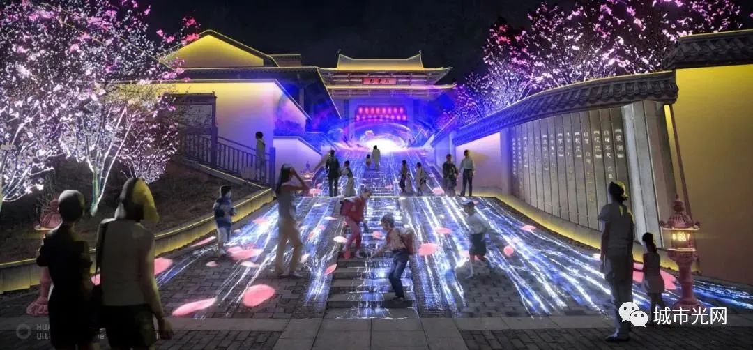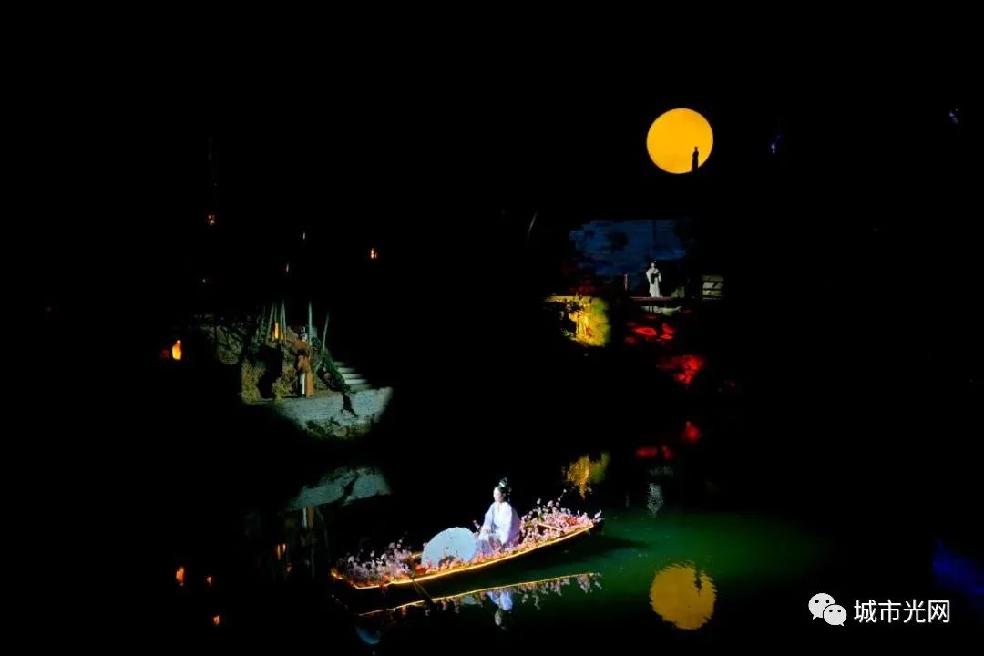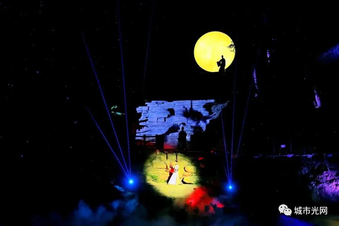 其通过灯光艺术装置等互动设备,融入裸眼3D、纱幕投影、光影互动、全景声等光影声感技术和高科技元素,在书堂山打造“全国首个森林全系剧场”和“全国首个行浸式5D诗词体验现场”,以现代科技活态演绎华夏五千年传统诗书文化。