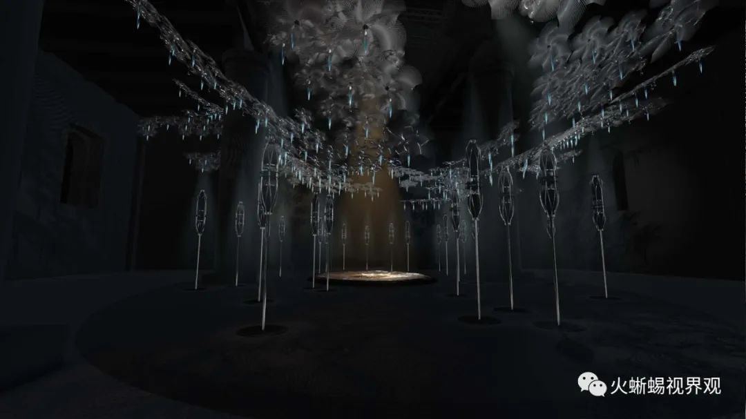 投影池周围环绕着图腾般的篮子状柱子,其中嵌入了定制扬声器,由作曲家Salvador Breed(萨尔瓦多·布里德)和阿姆斯特丹的4DSOUND设计的多通道空间声音环境。