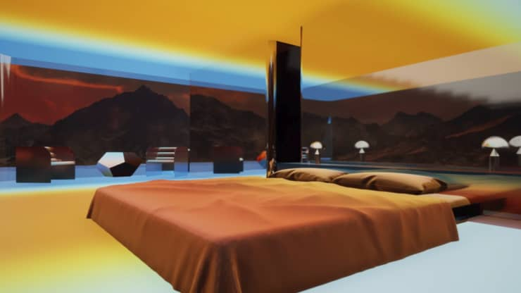 2020年,艺术家克里斯塔·金便曾创作了一件可以称之为其冥想哲学设计代表的NFT作品《火星房屋(Mars House)》。该作品描绘了一个带有未来科幻色彩的LED房间:艺术家采用开放式设计,用虚幻引擎(Unreal Engine)渲染出极简风格的渐变空间和落地玻璃墙,从而可以俯瞰一座充满情调的山脉。该作品可以通过VR设备体验,从而使观众进入到艺术家所创造的、具有其数字意识的沉浸冥想房间。《火星房屋(Mars House)》也因此成为全球第一个NFT 数字住宅。“我可以想象得到,未来会有数字建筑”,金说道,有了增强现实眼镜,“人们就会在数字房屋、数字空间里消磨时间。”