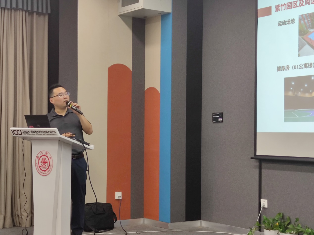 综合办公室主任丁亚培老师为同学们作学院教研基地概览与管理规范专题介绍。丁亚培概括说明了学院办学所在地——紫竹国际教育园区的相关情况及周边配套,从出行、饮食、住宿、园区物业服务等方面为大家提供了贴心实用的园区生活指南。随后,丁亚培还为新生详细讲解了学院教学楼宇的功能设定、教学空间分布、设施设备配套,以及包括文创书里在内的公共场馆预约使用规范及注意事项。