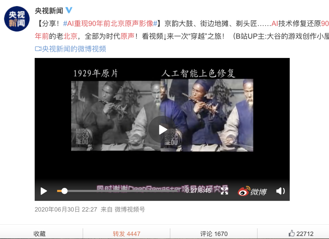 B站Up主大谷,基于飞桨的AI技术,重现了百年前的老北京,让观众们进行了一场“时空之旅”。视频一经推出不仅引起了观众的热烈反响,视频播放量迅速突破了220万,还得到了央视的认可和转发,引发了一波 AI 修复老旧影像的热潮。