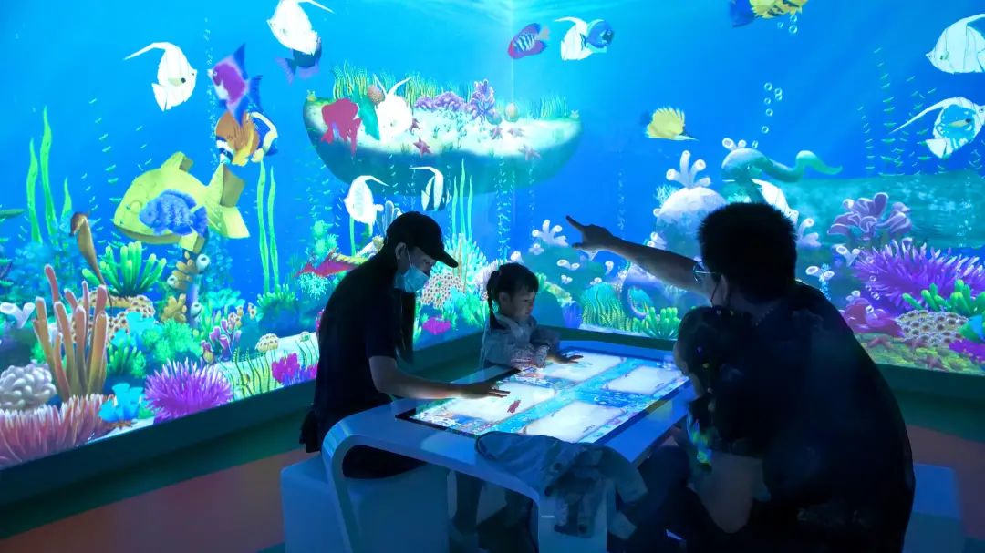 如果给孩子呈现广阔的海洋,鱼儿在其中徜徉,孩子伸出手就能与海洋里的生物互动,甚至可以挥动画笔,描绘出他们喜欢的样子,再通过神奇的“魔法”让孩子创造的生物在海洋中“活过来”。