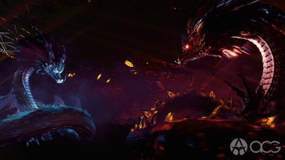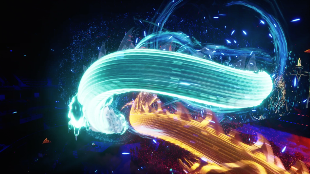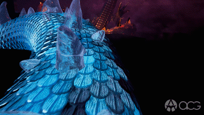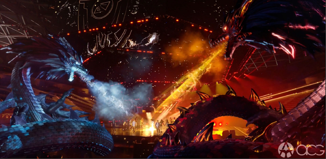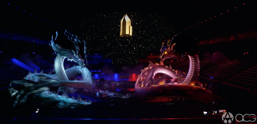伴随艾福杰尼的歌声,两条巨龙腾空而起,怒目相对,吞云吐雾,火焰喷射,好似奔腾在汹涌澎湃的云雾碧涛之间,此时LPL银龙杯再现舞台,双龙已弯折于杯身两侧,一气呵成的视觉特效,给观众带来了巨大的感官震撼,开幕式盛典也被推向高潮。