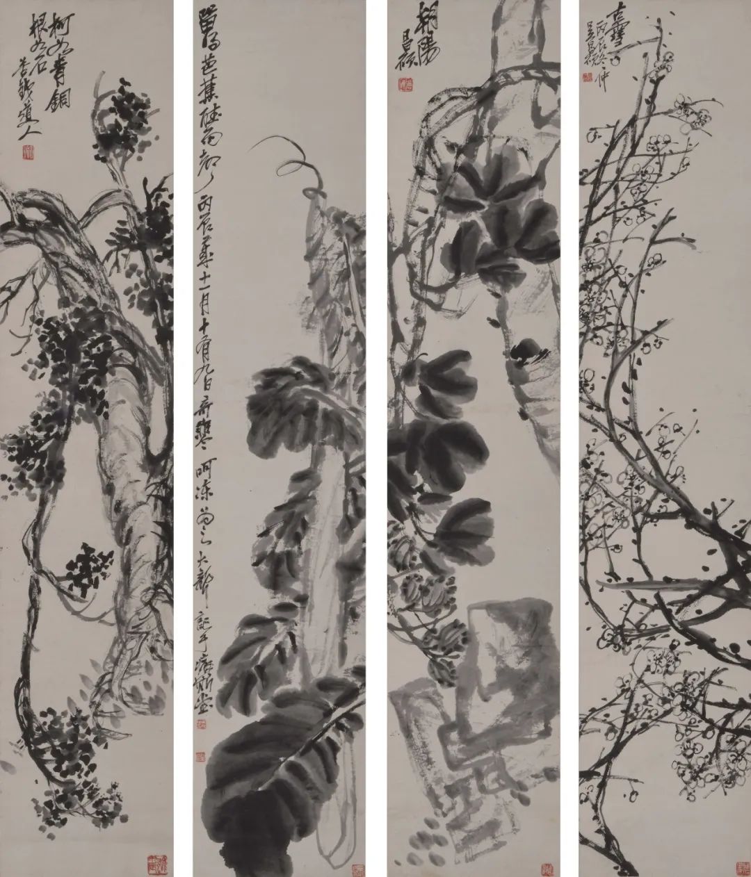 吴昌硕 《芭蕉松梅》 四条屏 1916 年 纸本水墨 各纵 134.5 厘米,横 27 厘米