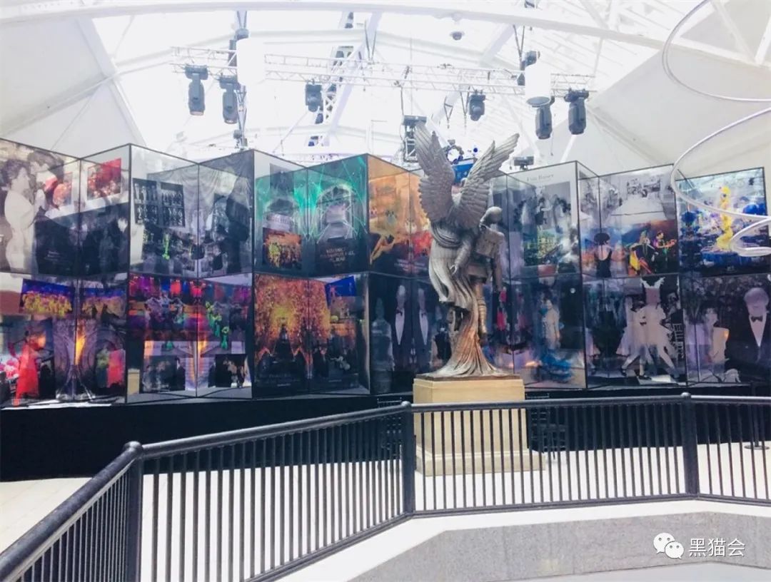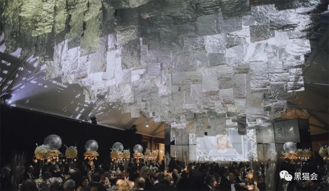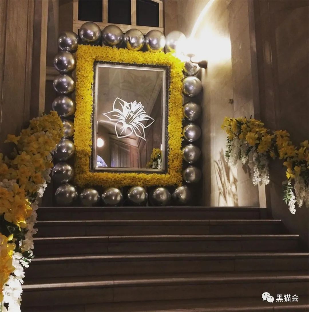 活动现场用于分隔鸡尾酒区与宴会区的隔断墙是半透明的,上面展示25年水仙花晚宴的发展历程,有不同时期晚宴现场的精彩瞬间以及参加活动的名人。