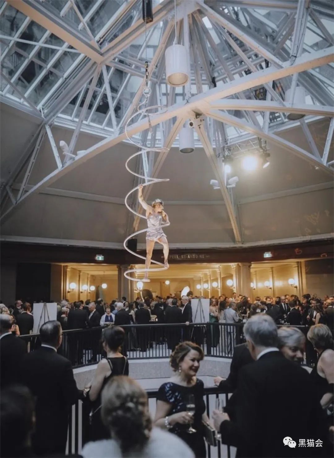 一位特技舞蹈表演艺术家在一根长约12米的螺旋金属棒上舞蹈,为正式晚宴前的鸡尾酒招待会增添一分精彩。