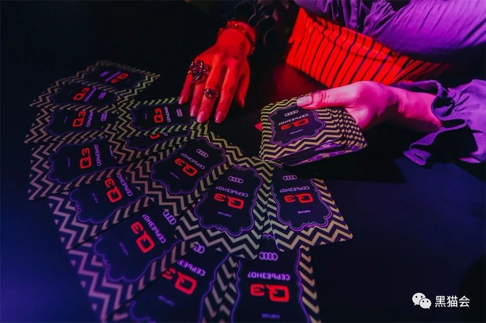活动现场被分为三个部分,第一部分明亮的照相打卡区,时尚的糖果女孩和其他马戏人偶来欢迎客人。塔罗牌区变成了吸引人的中心,客人们通过从算命人那里获得的卡片来了解自己的未来。