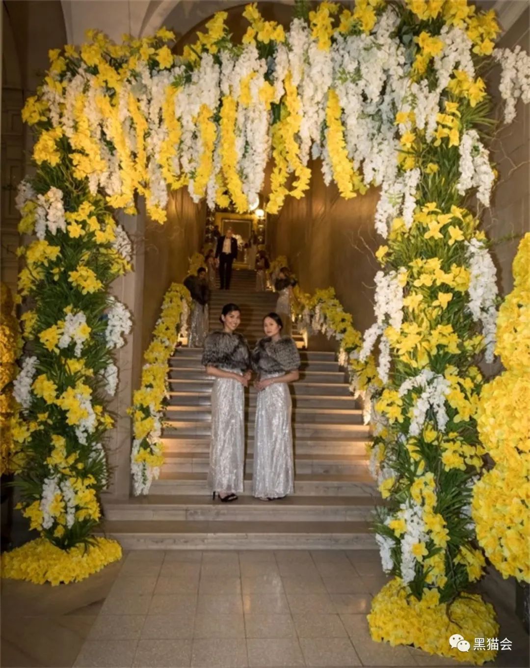 温莎车站长长的楼梯通道用水仙花装饰,两旁是身穿银色长袍和华丽皮草的礼仪在欢迎客人的到来。今年在楼梯尽头是一个华丽的水仙花框镜子,这是一个非常方便的拍摄社交媒体照片的打卡装置。