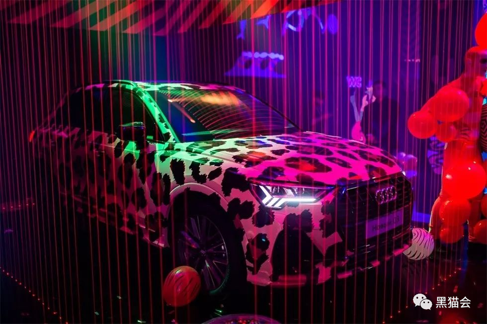 除了中央区域的“魔术师帽子”,在这个区域还有两个艺术装置。一辆被豹纹涂装的奥迪Q3被当作了“笼子里的豹子”,笼子是用激光束模拟而成的。
