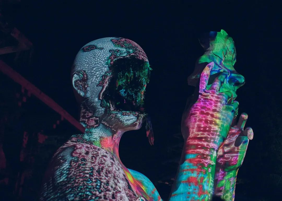 当夜幕降临,随着音乐强度的不断变换,这件作品被周围的投影仪360度“渲染”,呈现出与白天截然不同的视觉震撼,仿佛是闯入地球的外星人试图与人类建立某种联系。在迷幻音乐的烘托下,人们炙热的灵魂在现实与梦境间游荡,沉浸在不切实际的奇幻之境。