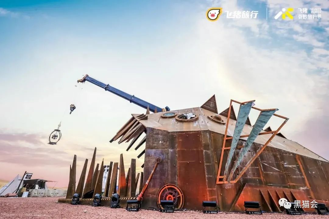 把海洋概念的大型装置艺术搬到沙漠中,包括用巨型吊车爆改而成的安康鱼酒馆、海神三叉戟造型的装置、“告别海螺”造型的活动空间、非遗文化展览等。在沙漠里造一片“大海”,与宁夏的星空相连,游客可实现一站式“打卡”。