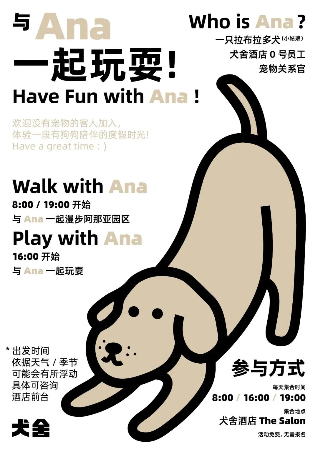 至于那些没有养狗,只能“云吸狗”的朋友,也不用担心入住孤单。因为Ana还有一项特别的工作——「与Ana一起玩耍」,早上8点和晚上7点,可以与客人一起漫步园区,而下午4点,则是一起玩耍的时间。作为一只需要大运动量的狗狗,Ana绝对是精力满满,给予来客有趣的陪伴。