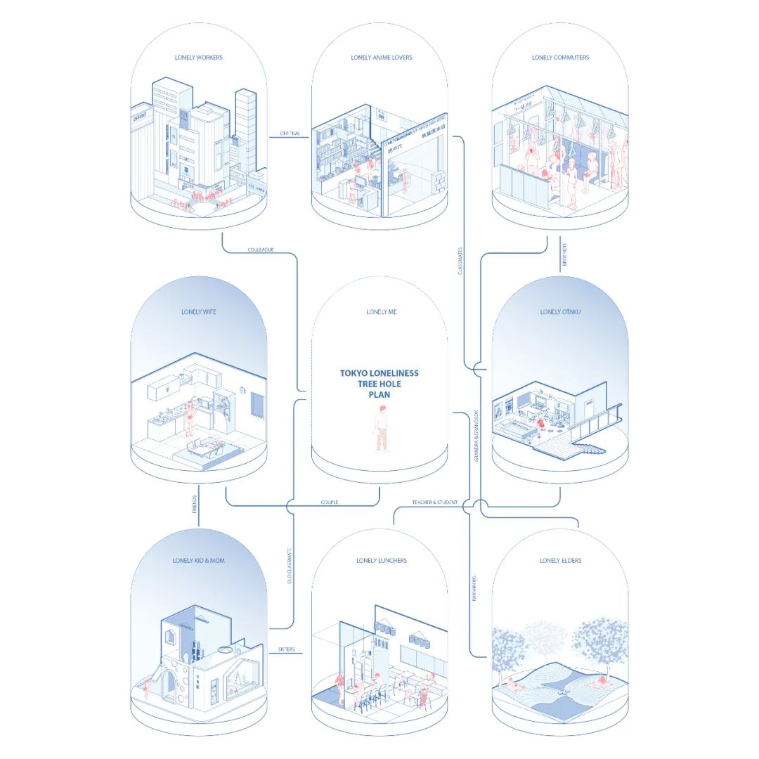 Eliminate Loneliness一等奖作品《From Eliminating to Elevating: Tokyo Loneliness Tree Hole Plan》运用情景为基的研究方法探讨东京人的多样孤独感 (credits: 蔡淦东 蔡明洁)