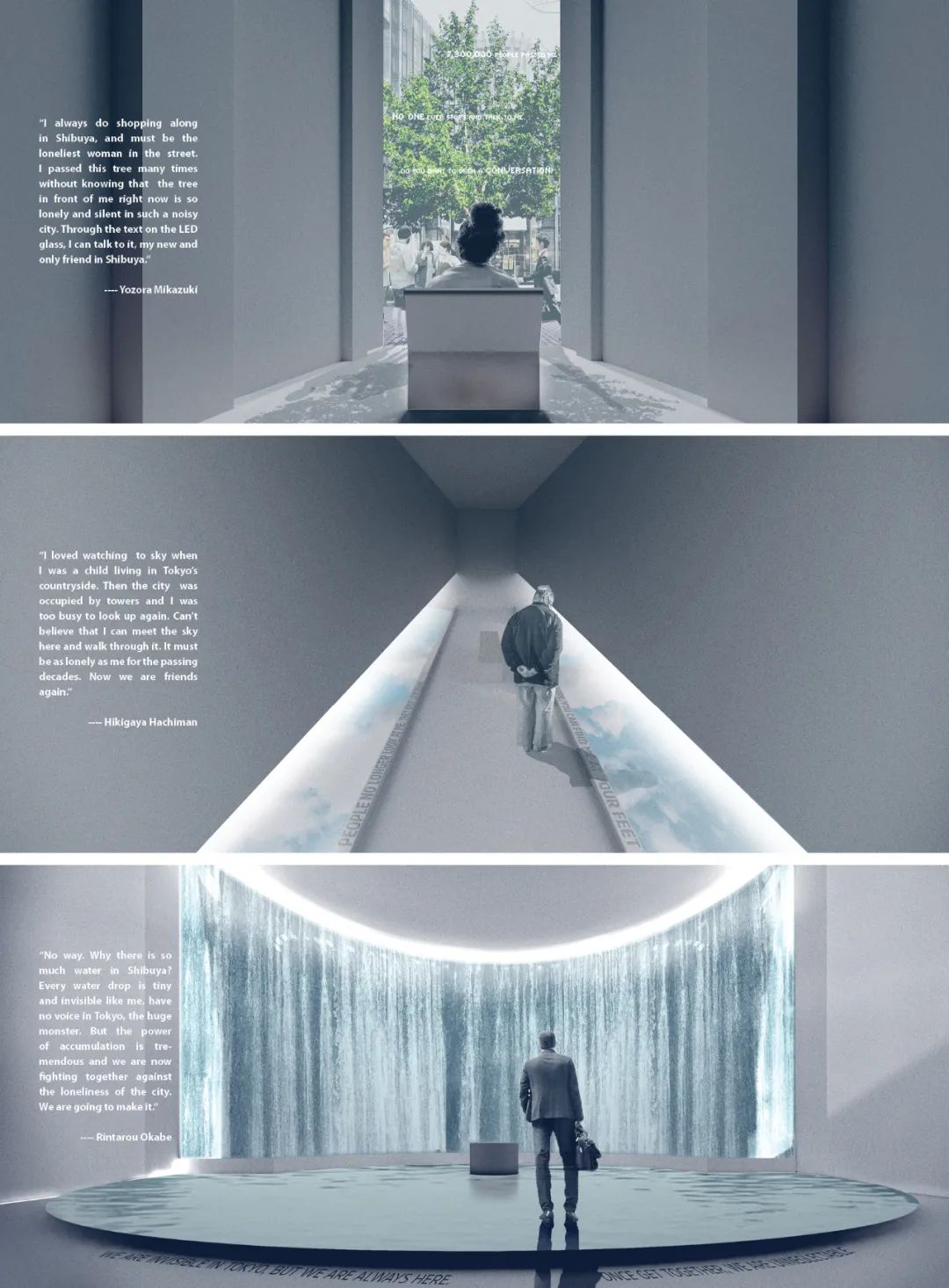 Eliminate Loneliness一等奖作品《From Eliminating to Elevating: Tokyo Loneliness Tree Hole Plan》植入闹市中供人独处的城市孤独树洞 (credits: 蔡淦东 蔡明洁)